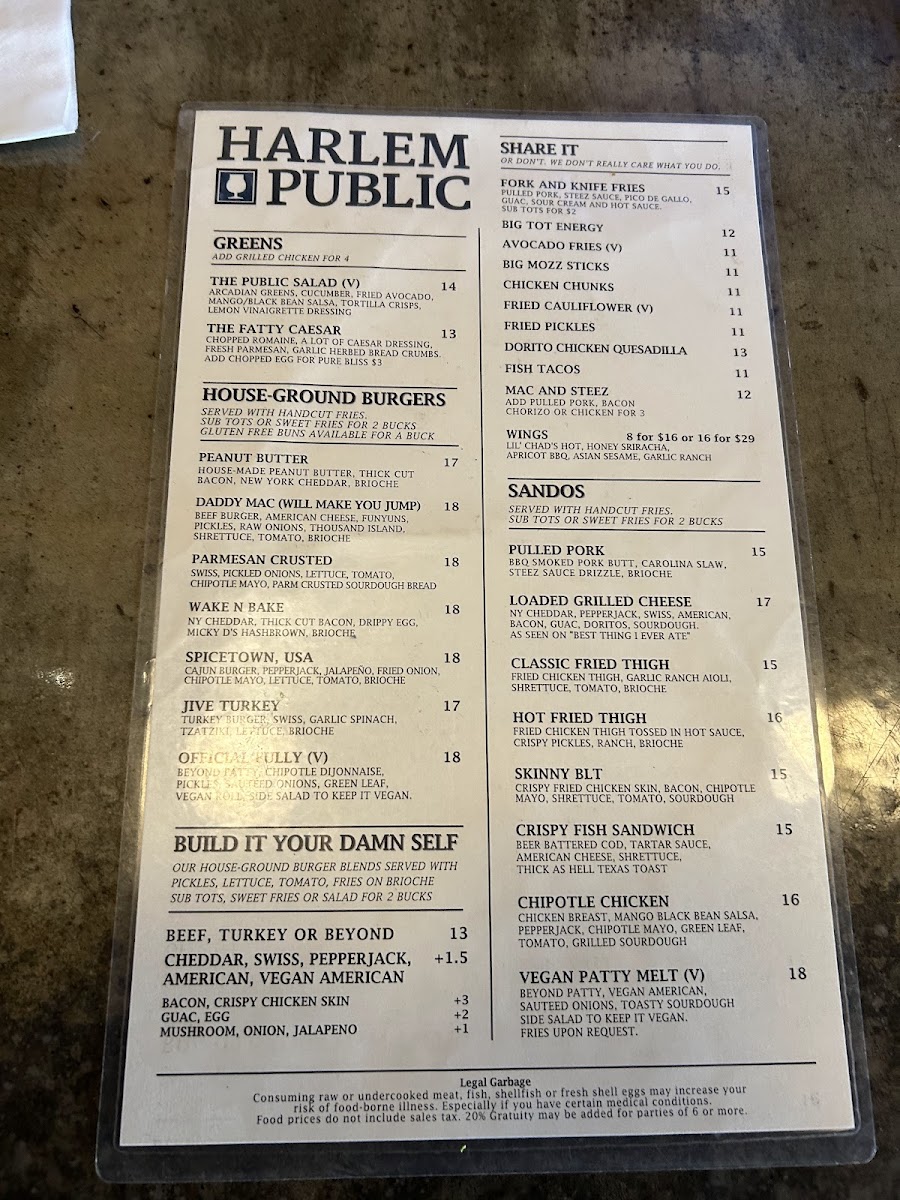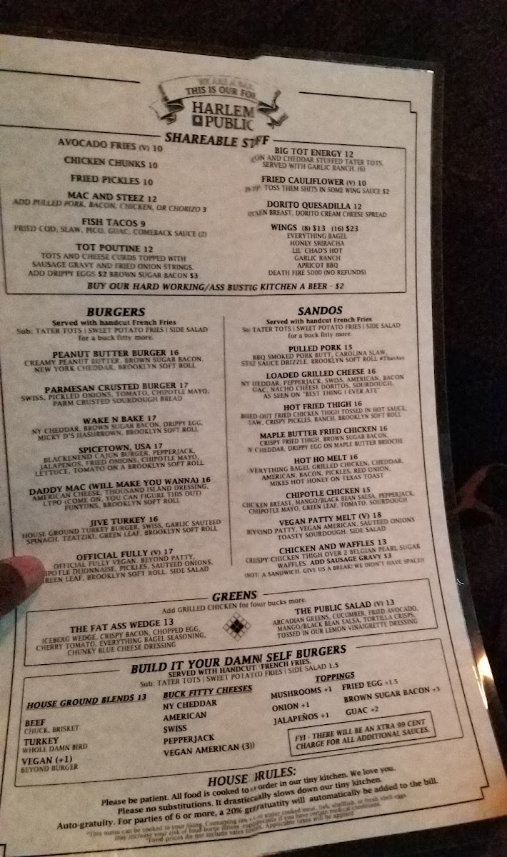 The menu at Harlem Public brings together a relaxed, pub-style selection of American classics with a few creative twists, making it easy to enjoy whether you’re dropping in for a casual drink or a laid-back meal. You’ll find a variety of shareable bites like crispy tater tots and fried avocado, alongside inventive sandwiches such as the Jive Turkey Burger or Peanut Butter Burger, balancing familiar comforts with unique flavors.